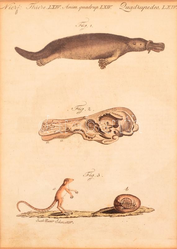 Jacob Xaver Schmuzer (1713-1775): Quadrupedes. Színezett rézmetszet, papír, jelzett a dúcon, paszpartuban, üvegezett fa keretben, körbevágott, 23x16,5 cm
