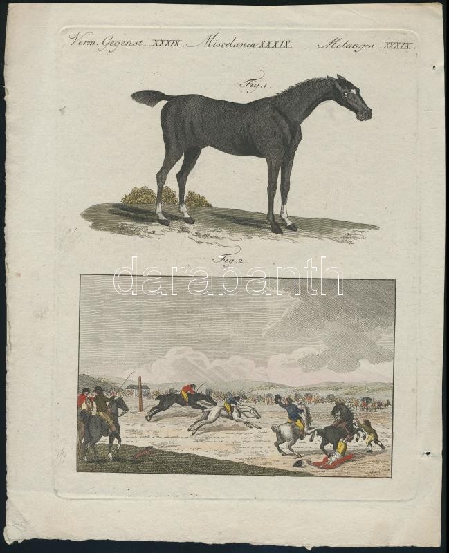 Leírás: XVIII. sz. színezett lovat és lovaspolót ábrázoló rézmetszet 17x23 cm