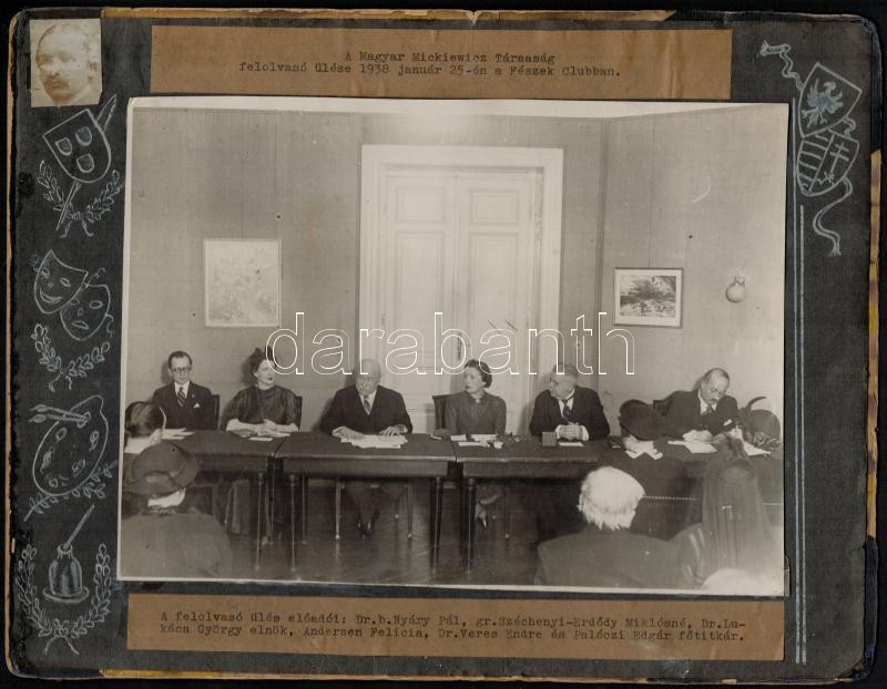 1938 Magyar Mickiewicz Társaság (Węgierskie Towarzyswo im. Mickiewicza) lengyel-magyar irodalmi és kulturális egyesület felolvasó ülése 1938. január 25-én a Fészek Club-ban. Rajta Nyáry Pál, Széchényi-Erdődy Miklósné, Lukács György, Andersen Felicia, Veres Endre, Pálóczi Edgár, fotó kartonon, feliratozva, 17x23 cm./