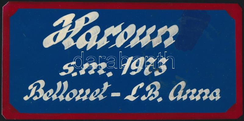 Leírás: Az osztrák pályarekorder Haroun ló budapesti bokszának táblája + 1 db róla készült fotó, 13×18 és 10×20 cm
