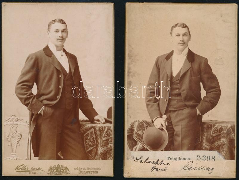 Leírás: cca 1900-1910 Schächter Jenő építész keményhátú fotója, 2 db, Bp., Koller Károly tanár utódai műterméből, az egyik feliratozva, 11x7 cm