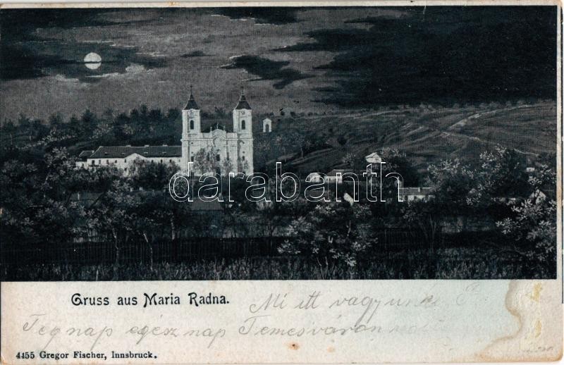 1903 Máriaradna, Radna; Kegytemplom holdfényben este. Gregor Fischer 4... https://www.darabanth.com/hu/344-Gyorsarveres/344.0/Kepeslapok/Erdely~1500005/1903-Mariaradna-Radna-Kegytemplom-holdfenyben-este-Gregor-Fischer-4455-pilgrimage-church-in-~II1942446