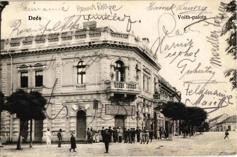 1906 Dés, Deés, Dej; Voith palota, Frank J. Mózes, Pruner Sándor üzlet... https://www.darabanth.com/hu/344-Gyorsarveres/344.0/Kepeslapok/Erdely~1500005/1906-Des-Dees-Dej-Voith-palota-Frank-J-Mozes-Pruner-Sandor-uzlete-street-view-with-shop~II1952483