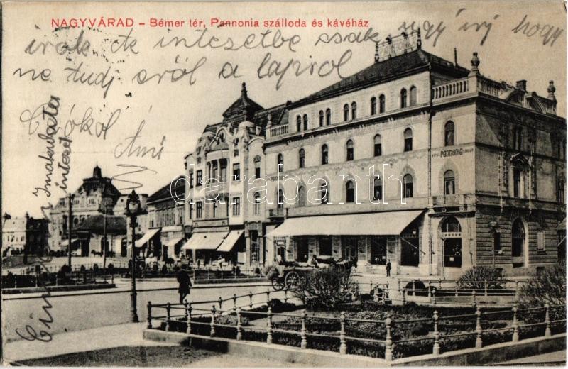 1911 Nagyvárad, Oradea; Bémer tér, Pannonia szálloda és kávéház, üzlet... https://www.darabanth.com/hu/344-Gyorsarveres/344.0/Kepeslapok/Erdely~1500005/1911-Nagyvarad-Oradea-Bemer-ter-Pannonia-szalloda-es-kavehaz-uzletek-street-view-hot~II1940683