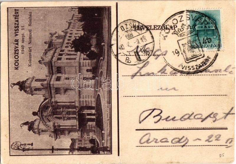 Leírás: 1940 Kolozsvár, Cluj; Nemzeti Színház. Kolozsvár visszatért / theatre + "1940 Kolozsvár visszatért" So. Stpl (EK)
