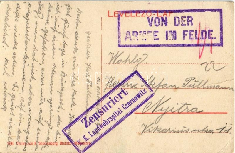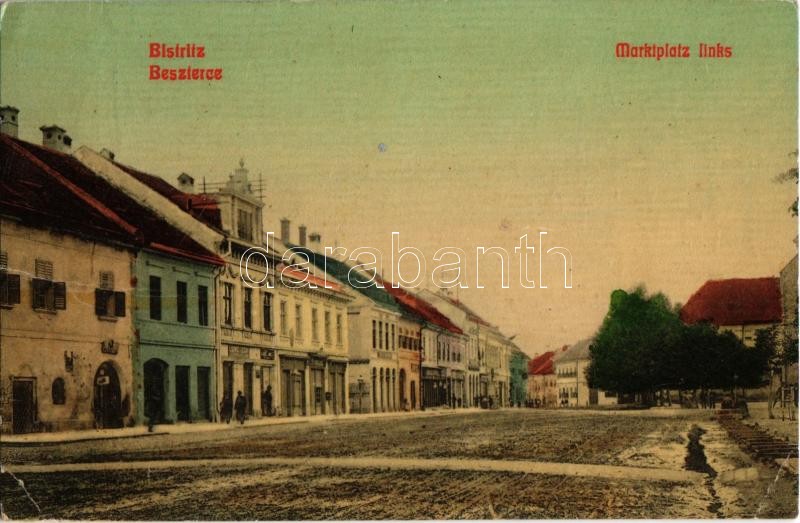 Beszterce, Bistritz, Bistrita; Marktplatz links / Piac tér bal oldali nézete, Ludwig Izsák üzlete. Kiadja F. Stolzenberg 206. / market square, shops + 1916 K. k. Landwehrspital Czernowitz (EK)