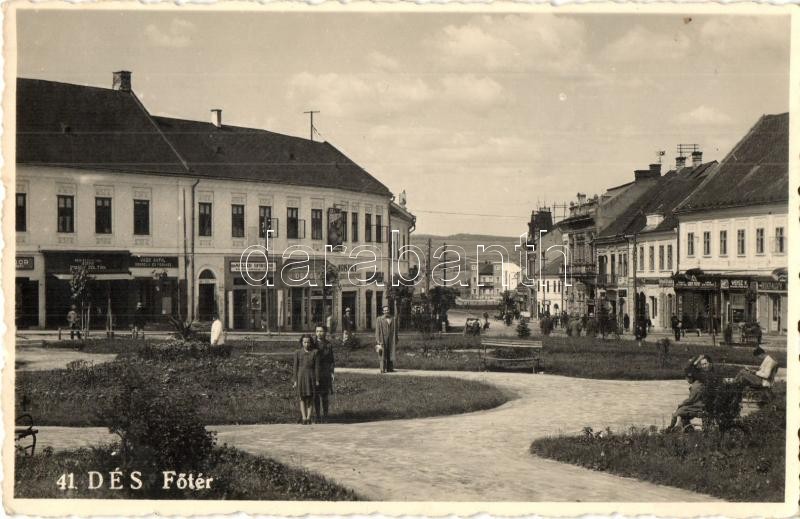 Dés, Dej; Fő tér, Lesáky Zoltán "Korvin", Vass Antal borbély, özv. Müller Györgyné, kristály porcelán, Gamenczy Jakab, Szigeti József, Weiss K., Bikfalvy és ABC üzlet / main square with shops (Rb)