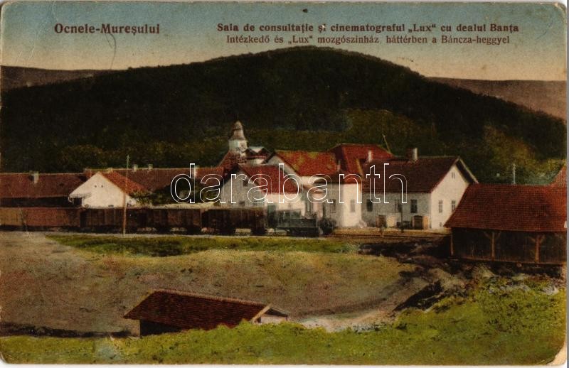 Marosújvár, Ocna Mures; Sala de consultatie si cinematograful "Lux" cu dealul Banta. Edit. Libraria Filip Banciu / Intézkedő és "Lux" mozgószínház (mozi), háttérben a Báncza heggyel / consultation office, cinema, mountain (EB)
