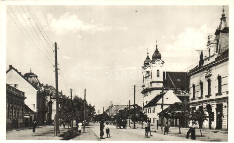 Leírás: Galánta, Fő utca, templom, bank / main street with bank and church