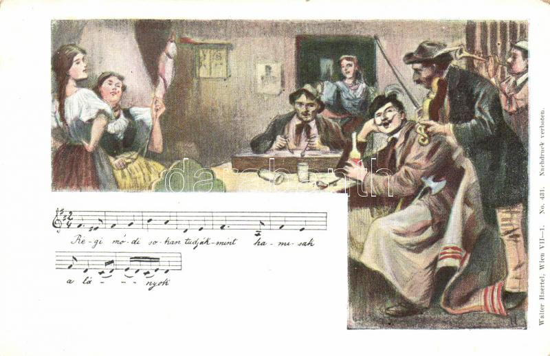 Leírás: 'Régi módi sokan tudják mint hamisak a lányok...' Magyar népviselet / Hungarian folklore, sheet music, Walter Haertel No. 431.