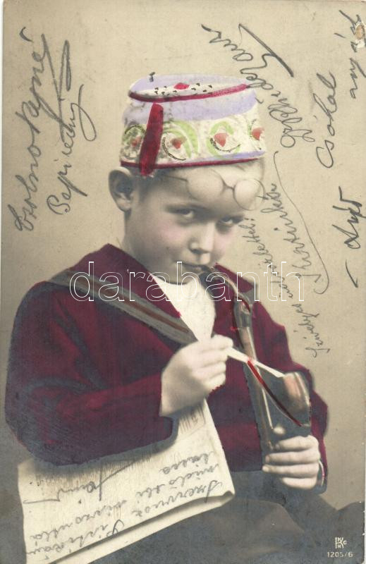 Boy smoking a pipe, as a Turkish boy https://www.darabanth.com/hu/344-Gyorsarveres/344.0/Kepeslapok/Gyerek~1500060/Boy-smoking-a-pipe-as-a-Turkish-boy~II920333