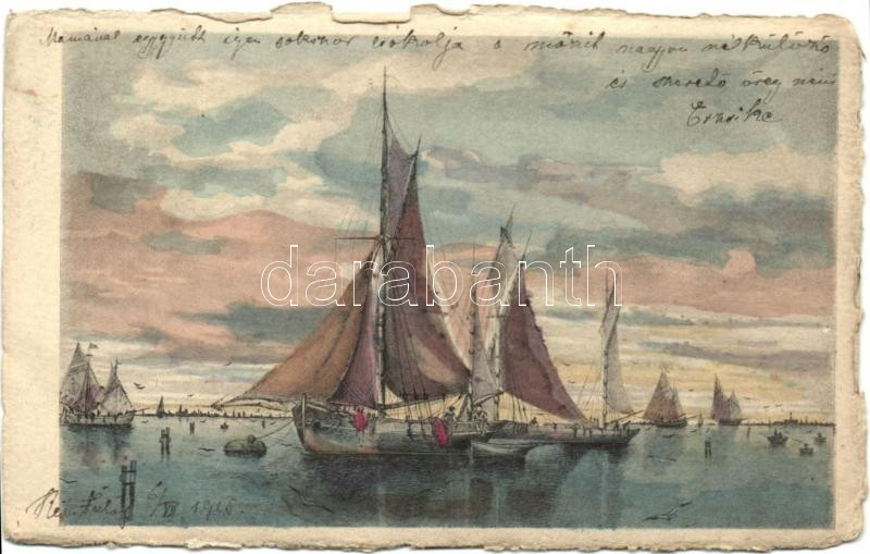 Sailboats, hand-painted postcard, aquarell https://www.darabanth.com/hu/344-Gyorsarveres/344.0/Kepeslapok/Hajo~1500062/Sailboats-hand-painted-postcard-aquarell~II920324