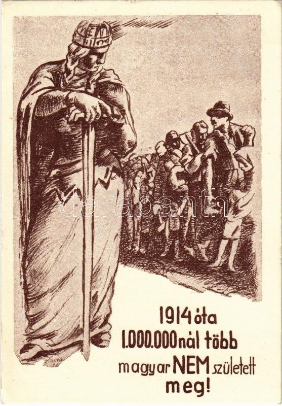 1914 óta 1000000-nál több magyar nem született meg! A Magyar Szülők Szövetsége nemzetvédelmi mozgalma az egyke ellen / Hungarian irredenta propaganda art postcard for the birth rate increase s: Zartler