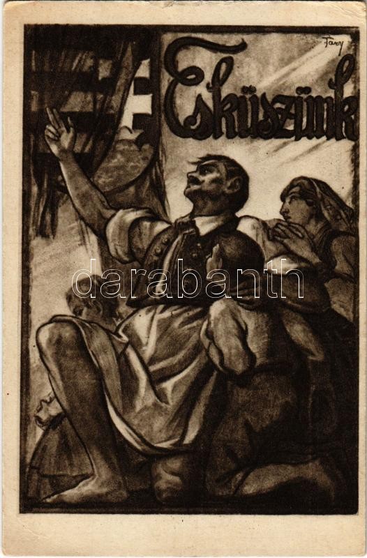 Leírás: Esküszünk! Kiadja a "Szózat" Magyarország Területi Épségének Védelmi Ligája napilapja / Hungarian irredenta propaganda s: Tary Lajos (EK)