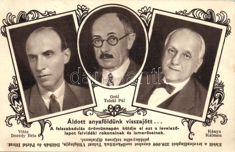 Leírás: Felvidék visszacsatolásának emlékére. Áldott anyaföldünk visszajött... Vitéz Imrédy Béla, Gróf Teleki Pál, Kánya Kálmán. Tolnai Nyomda kiadása / Entry of the Hunagrian troops, Irredenta, Art Nouveau (EK)