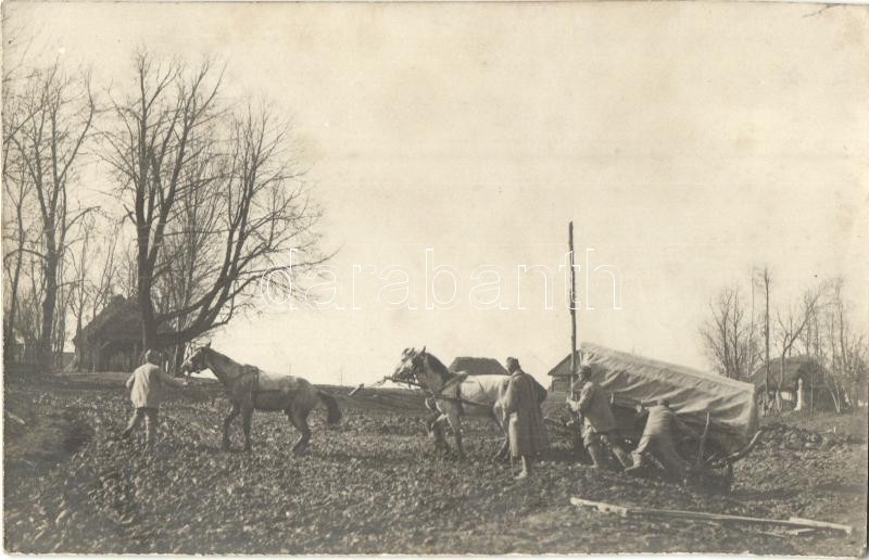 1916 Trén (málhás szekerek menetoszlopa és legénysége) mozgatása sárba... https://www.darabanth.com/hu/344-Gyorsarveres/344.0/Kepeslapok/Katonai~1500069/1916-Tren-malhas-szekerek-menetoszlopa-es-legenysege-mozgatasa-sarban-WWI-Kuk-militar~II1667396