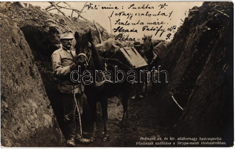 Főzőládák szállítása a Strypa-menti lövészárokban. Hofmann cs. és kir. altábornagy hadcsoportja. Hadifénykép Kiállítás / WWI Austro-Hungarian K.u.K. military, transporting the food supply with horses in the trenches along River Strypa (EK)