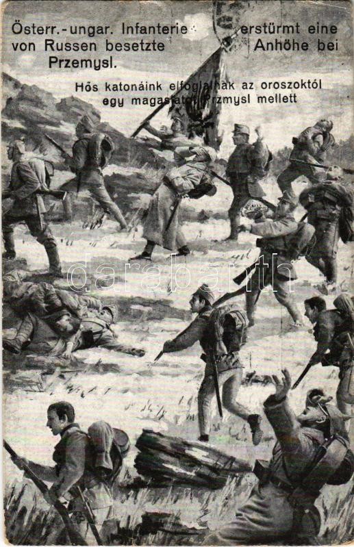 Leírás: Hős katonáink elfoglalnak az oroszoktól egy magaslatot Przmysl mellett / WWI K.u.K. military art postcard (EK)
