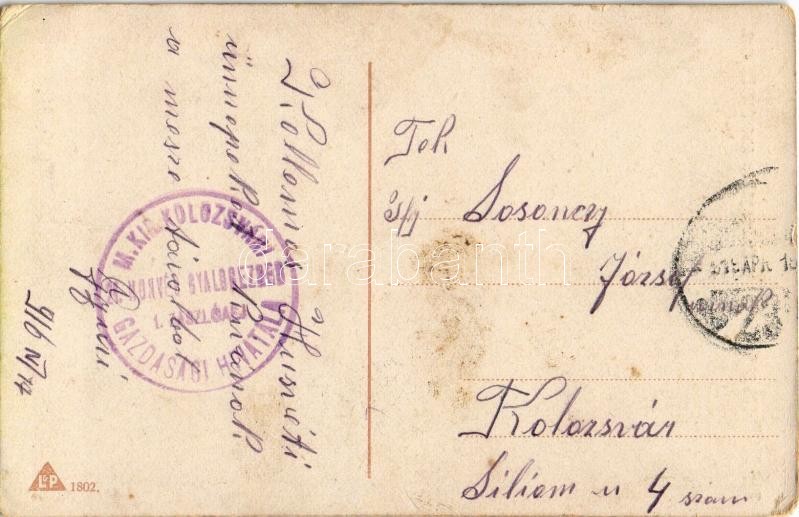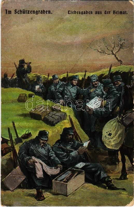 Im Schützengraben. Liebesgaben aus der Heimat / WWI K.u.K. military art postcard + "M. kir. Kolozsvári 21. honvéd gyalogezred 1. zászlóalj gazdasági hivatala" (EK)
