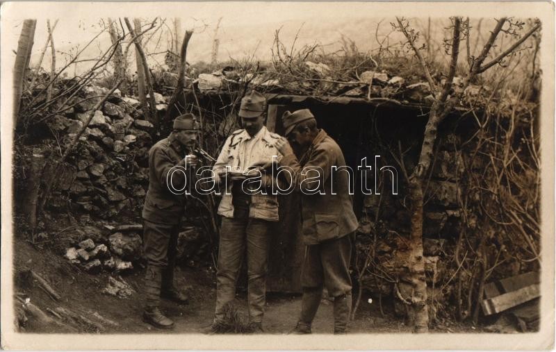 Levél felolvasása a futóárok végén készített, álcázott szálláshely előtt / WWI Austro-Hungarian K.u.K. military, soldiers reading a letter next to the camouflaged accomodation in the trenches. photo (felületi sérülés / surface damage)