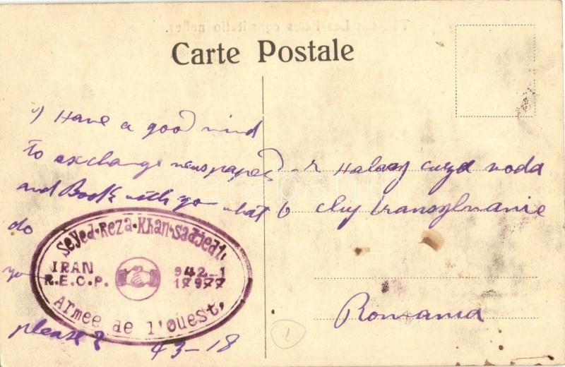 Téhéran les Fetes constitutionnelles / A perzsa alkotmány ünnepi menete katonákkal / Celebration of the Persian Constitution in Tehran, soldiers, flags, crowd. TCV card