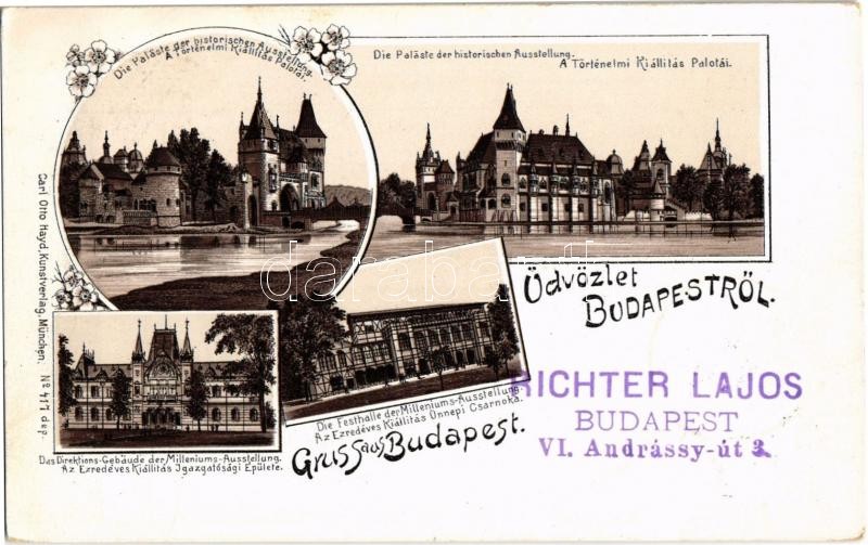 Leírás: 1897 Budapest, Történelmi kiállítás palotái, Ezredéves Kiállítás igazgatósági épülete és ünnepi csarnoka. Carl Otto Hayd floral, Art Nouveau, litho