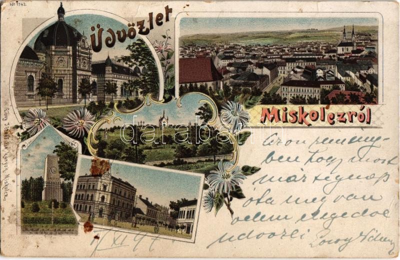 Leírás: 1897 (Vorläufer!) Miskolc, Pálóczy emlék, kálvária, városház, Erzsébet fürdő. Lövy József és fia floral, Art Nouveau, litho (fa)