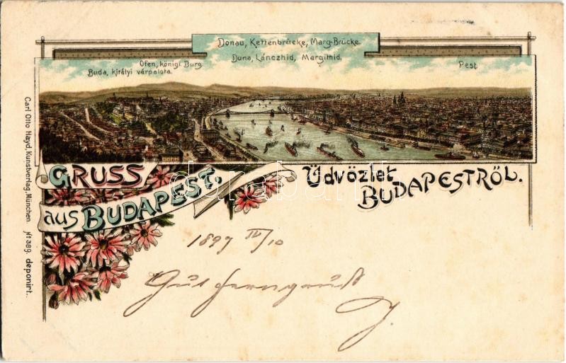 Leírás: 1899 Budapest, Budai királyi várpalota, Lánchíd és Margithíd. Carl Otto Hayd floral litho