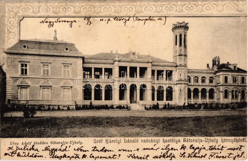 Leírás: 1902 Füzérradvány, Radvány (Sátoraljaújhely környéke); Gróf Károlyi László kastélya. Kiadja Lövy Adolf (EK)