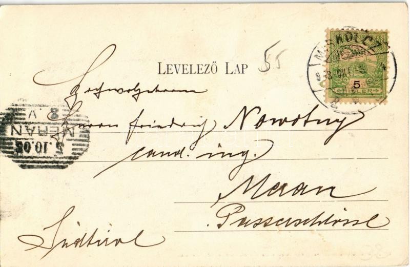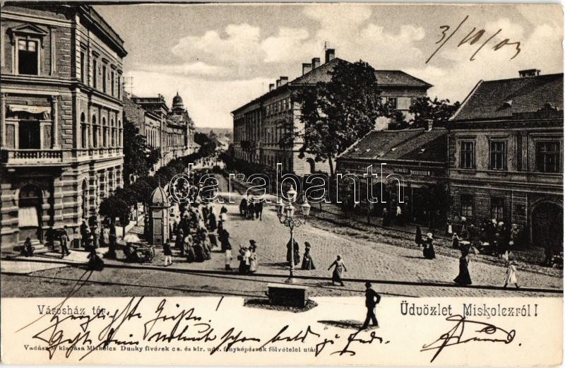 Leírás: 1903 Miskolc, Városház tér, üzletek. Kiadja Vadász M. Dunky Fivérek cs. és kir. udvari fényképészek felvételei után