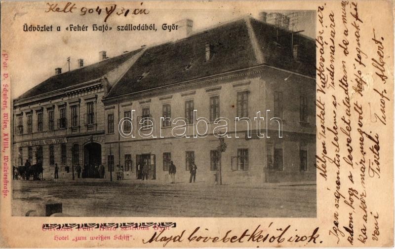 1904 Győr, Fehér Hajó szálloda (r) https://www.darabanth.com/hu/344-Gyorsarveres/344.0/Kepeslapok/Magyarorszag~1500004/1904-Gyor-Feher-Hajo-szalloda-r~II1952140