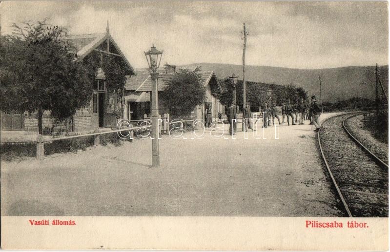 Leírás: 1910 Piliscsaba, Piliscsabai tábori vasútállomás katonákkal. Kiadja Kriston József