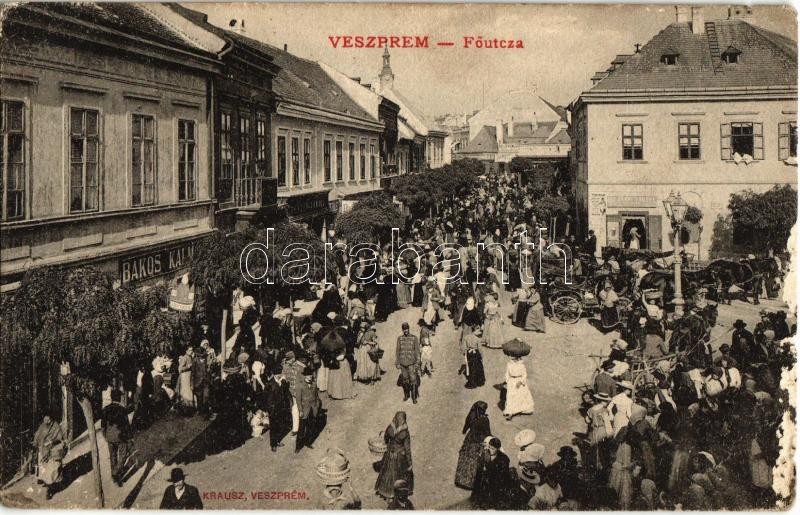 1910 Veszprém, Fő utca, Bakos Kálmán üzlete, tömeg, piac. Kiadja Kraus... https://www.darabanth.com/hu/344-Gyorsarveres/344.0/Kepeslapok/Magyarorszag~1500004/1910-Veszprem-Fo-utca-Bakos-Kalman-uzlete-tomeg-piac-Kiadja-Krausz-kis-szakadasok-sma~II1952198