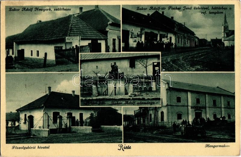 1938 Ricse, Zukor Adolf (magyar származású producer, a Paramount Pictures filmvállalat alapítója, a hollywoodi filmgyártás egyik létrehozója) szülőháza, Zukor Adolf tér Fischer Jenő üzletével, háttérben a Református templom, Főszolgabírói hivatal, Hengermalom (tulajdonos Zucker Ignác), Artézi kút (Zukor Adolf adománya)