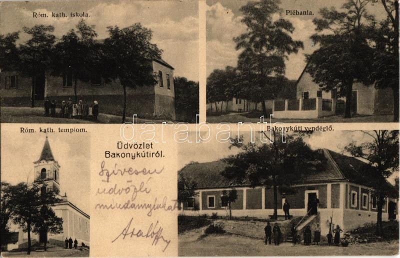Leírás: Bakonykúti, Római katolikus iskola és templom, Plébánia, Bakonykúti vendéglő, étterem. Szilágyi Arthur fényképész
