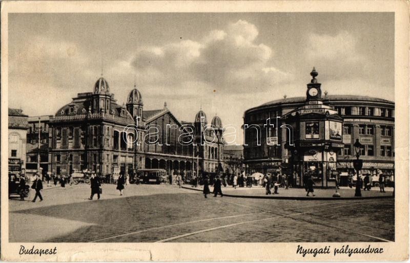 Leírás: Budapest VI. Nyugati pályaudvar, óra, villamos, vendéglő, Stühmer üzlet (kis szakadás / small tear)