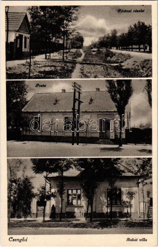 Csengőd, Fő utca, Posta hivatal, Bakai villa. Kiadja Szaszler https://www.darabanth.com/hu/344-Gyorsarveres/344.0/Kepeslapok/Magyarorszag~1500004/Csengod-Fo-utca-Posta-hivatal-Bakai-villa-Kiadja-Szaszler~II1948634