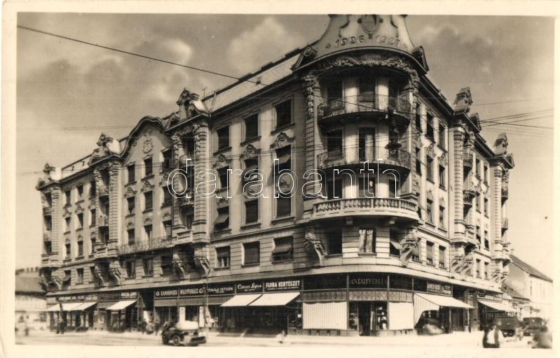 Debrecen, Városi bérház a Szent Anna utcában, Ramminger hölgyfodrász, Tokaji István, Cziczó Lajos, Flóra kertészet, Antalfy Gyula és Almássy Dezső üzlete, drogéria