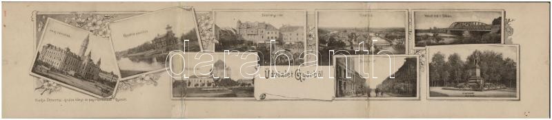 Győr, 3-részes kihajtható lap, rajta: Az új városháza, Regatta pavilon evezős csónakokkal, Széchenyi tér, Izraelita templom, zsinagóga, Újváros, Baross út üzletekkel, Vasúti híd a Rábán, Kisfaludy szobor. Kiadja Ehrenthal Ignác, Art Nouveau, floral (r)