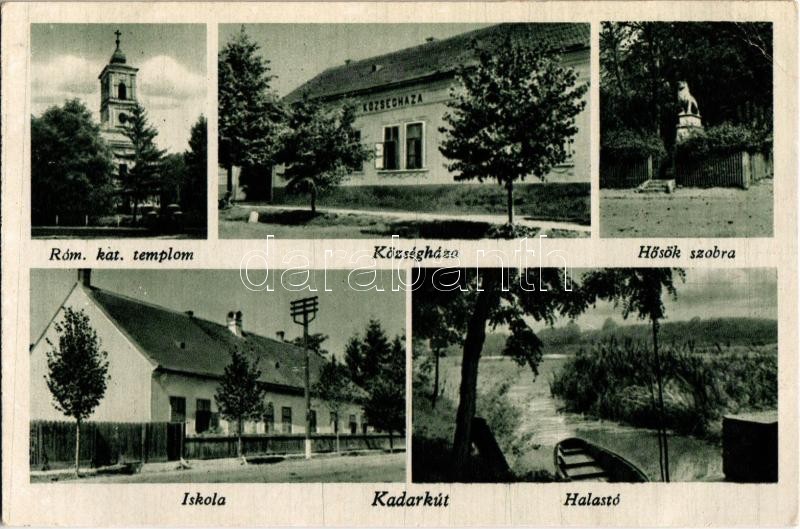 Leírás: Kadarkút, Római katolikus templom, Községháza, Hősök szobra, emlékmű, Iskola, Halastó. Kiadja Stadler (EK)