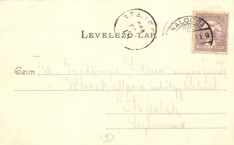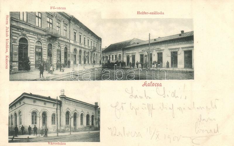 Leírás: Kalocsa, Fő utca, Klein Ignác és Stern Jakab üzletei, Helfer szálloda, Városháza. Stern Jakab kiadása