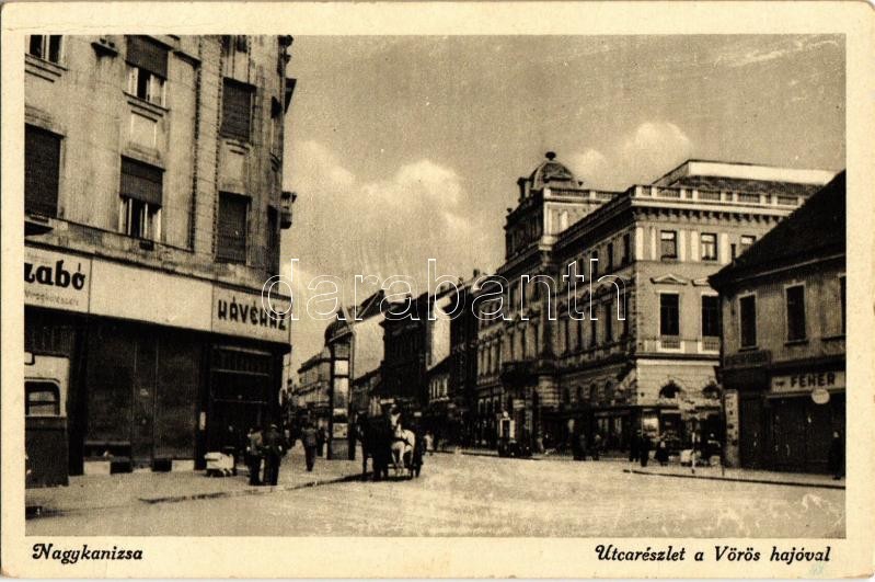 Nagykanizsa, utcakép a Vörös hajóval, kávéház, Fehér, Szabó üzlete https://www.darabanth.com/hu/344-Gyorsarveres/344.0/Kepeslapok/Magyarorszag~1500004/Nagykanizsa-utcakep-a-Voros-hajoval-kavehaz-Feher-Szabo-uzlete~II1942465