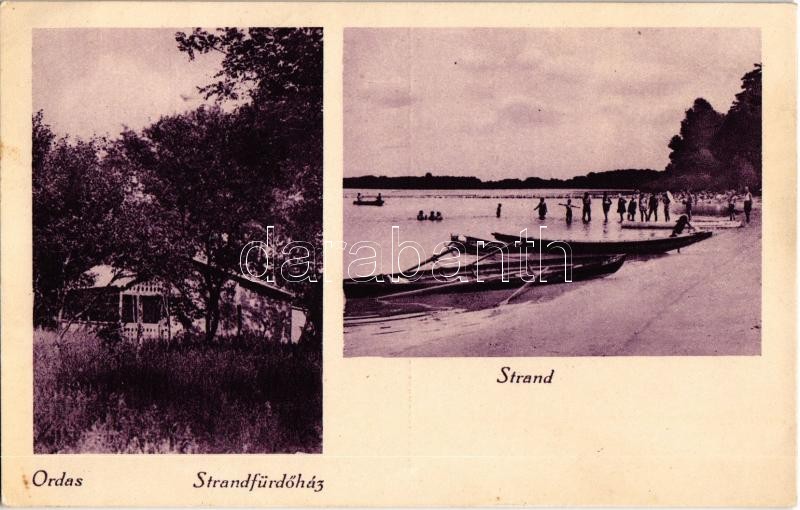 Leírás: Ordas, Strandfürdőház, strand, fürdőzők, evezős csónakok. Tumpek fényképész kiadása (EK)