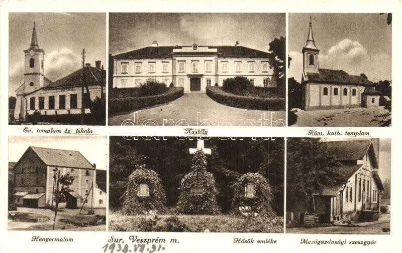 Súr, Evangélikus templom és iskola, Zichy kastély, Római katolikus templom, Hengermalom, Hősök emléke, Mezőgazdasági szeszgyár. Kiadja a Hangya szövetkezet
