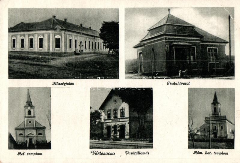 Leírás: Vértesacsa, Községháza, Posta hivatal, Református templom, Vasútállomás, Római katolikus templom (EK)