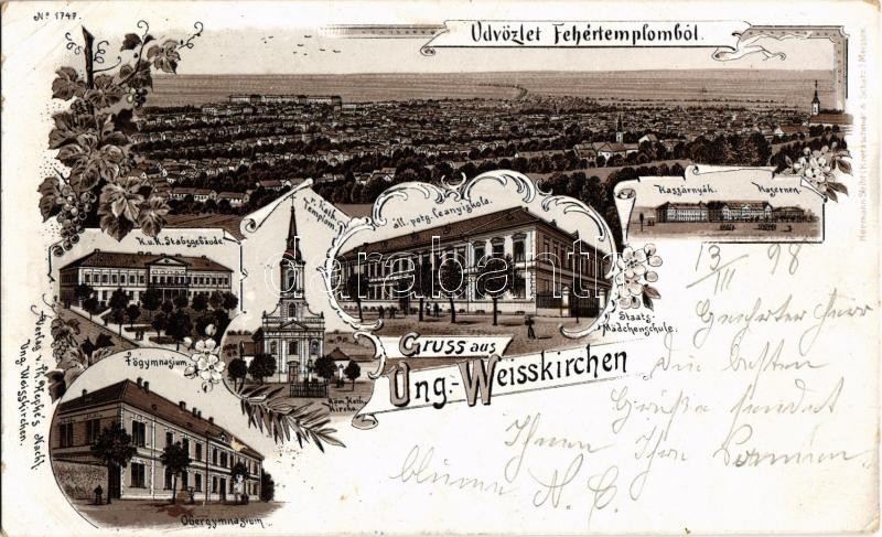 1898 Fehértemplom, Ung. Weisskirchen, Bela Crkva; Főgimnázium, kaszárnyák, Állami polgári leányiskola, Római katolikus templom, Cs. és kir. tiszti kaszinó / schools, K.u.K. military officers' casino, barracks. Th. Hepkés Art Nouveau, floral, litho (EK)