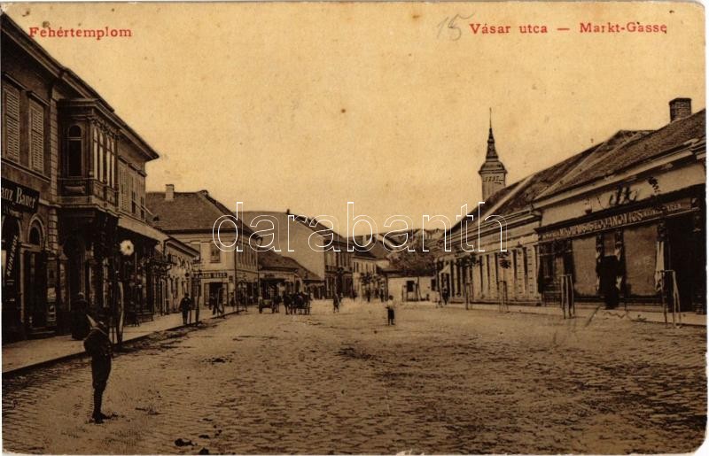 1908 Fehértemplom, Ung. Weisskirchen, Bela Crkva; Vásár utca, Bauer, Nikolaus Stojanovics üzlete. W. L. 1168. / Markt-Gasse / street view with shops (EM)