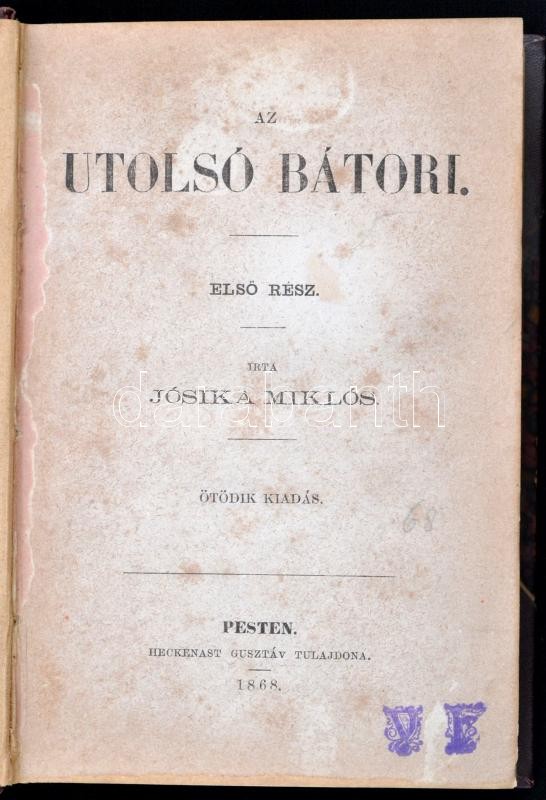 Leírás: Jósika Miklós: Az utolsó Bátori. I-II. egybe kötve. Pest, 1868. Heckenast. Korabeli félvászon kötésben.