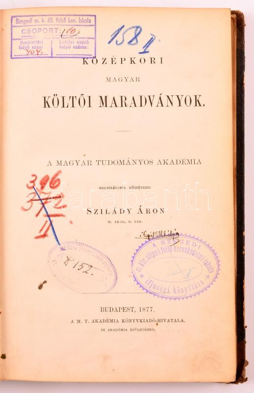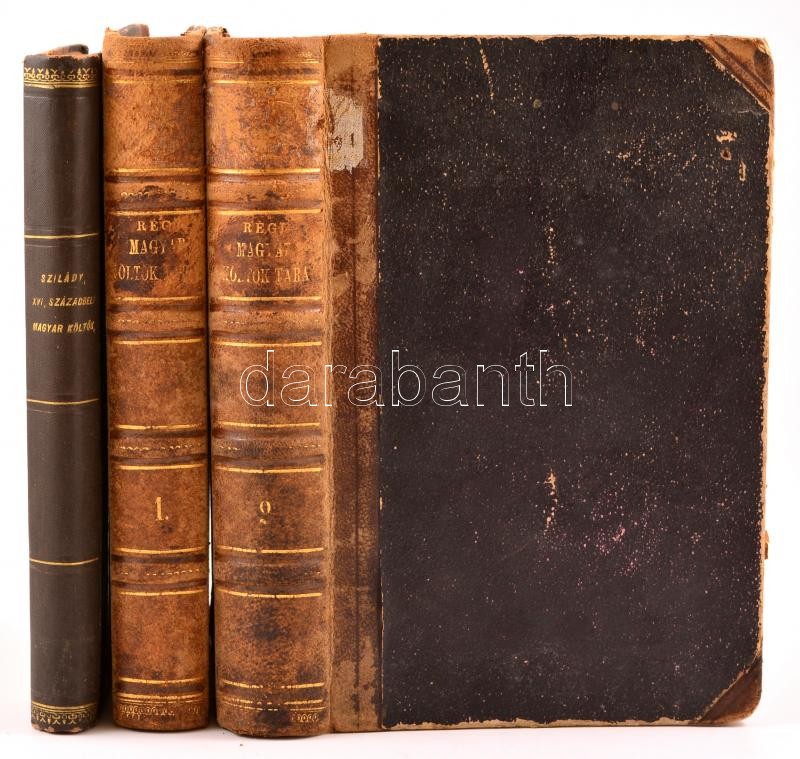 Régi magyar költők tára I-II.,VI. kötetek. I. kötet.: Középkori magyar költői maradványok. II. XVI. századbeli magyar költők művei 1527-1546. VI. kötet: XVI. századbeli magyar költők tára. 1545-1559. Közzéteszi Szilády Áron. Bp.,1877-1880-1896, MTA. Korabeli félbőr-kötés és félvászon-kötések, márványozott lapélekkel, kopott borítóval, intézményi bélyegzőkkel, az I. kötetből pár lap kijár, a VI. kötetben egy lap szakadt.
