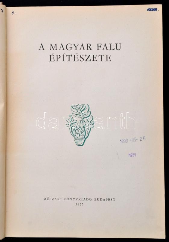 Károlyi Antal et alii (szerk.): A magyar falu építészete. Bp., 1955, Műszaki Könyvkiadó. Fekete-fehér fotókkal illusztrált. Kiadói egészvászon kötésben, volt könyvtári példány, kissé foltos borítóval. Megjelent 2000 példányban.